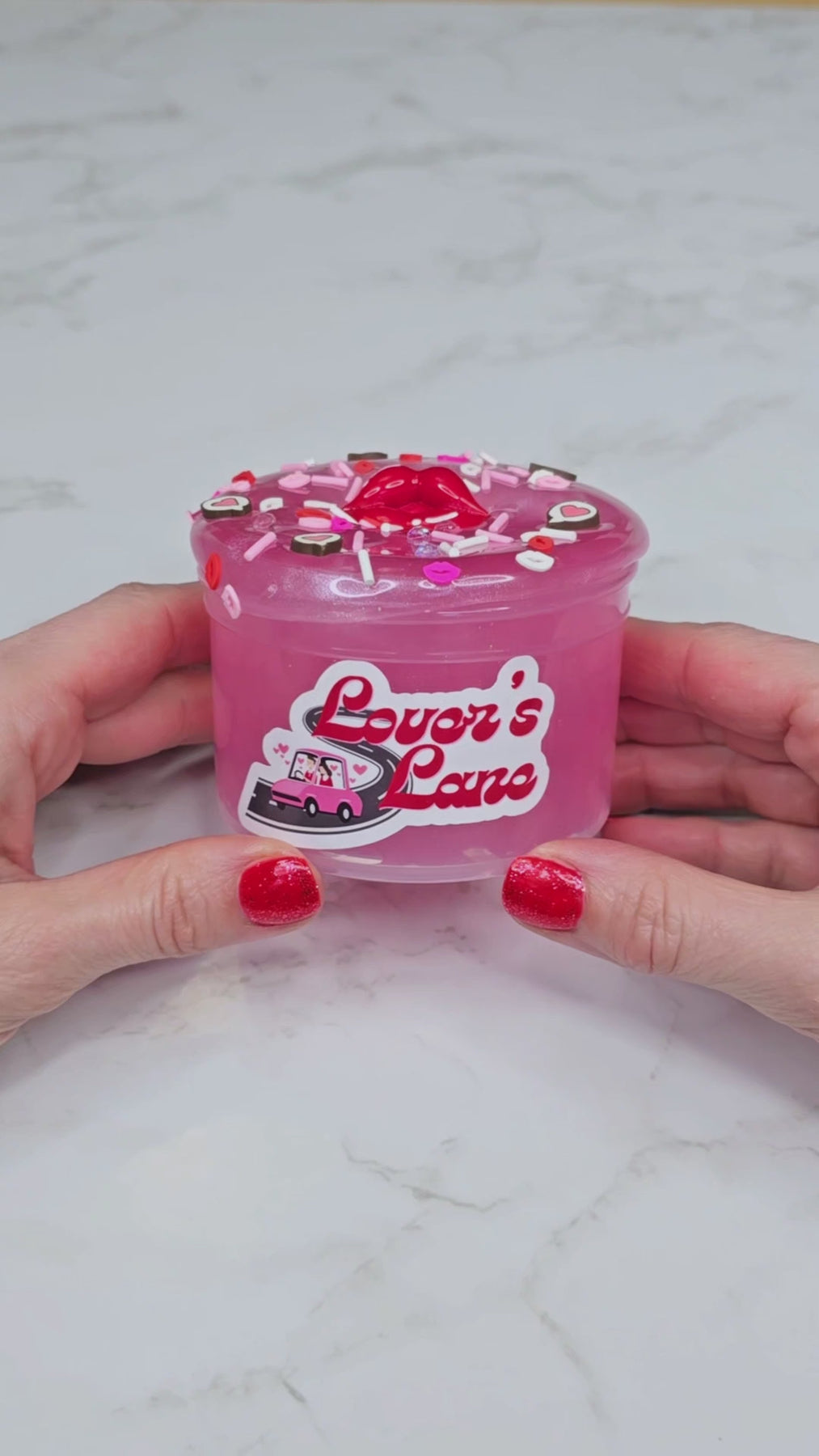 Lover's Lane is a thick coated clear that's shimmery pink. It has a ton of kissy addins and some fun conersation heart fimos. Lover's Lane is great for loud fger pokes and big bubble pops! Throw this on e in the fridge and get a whole new thick putty like experience.