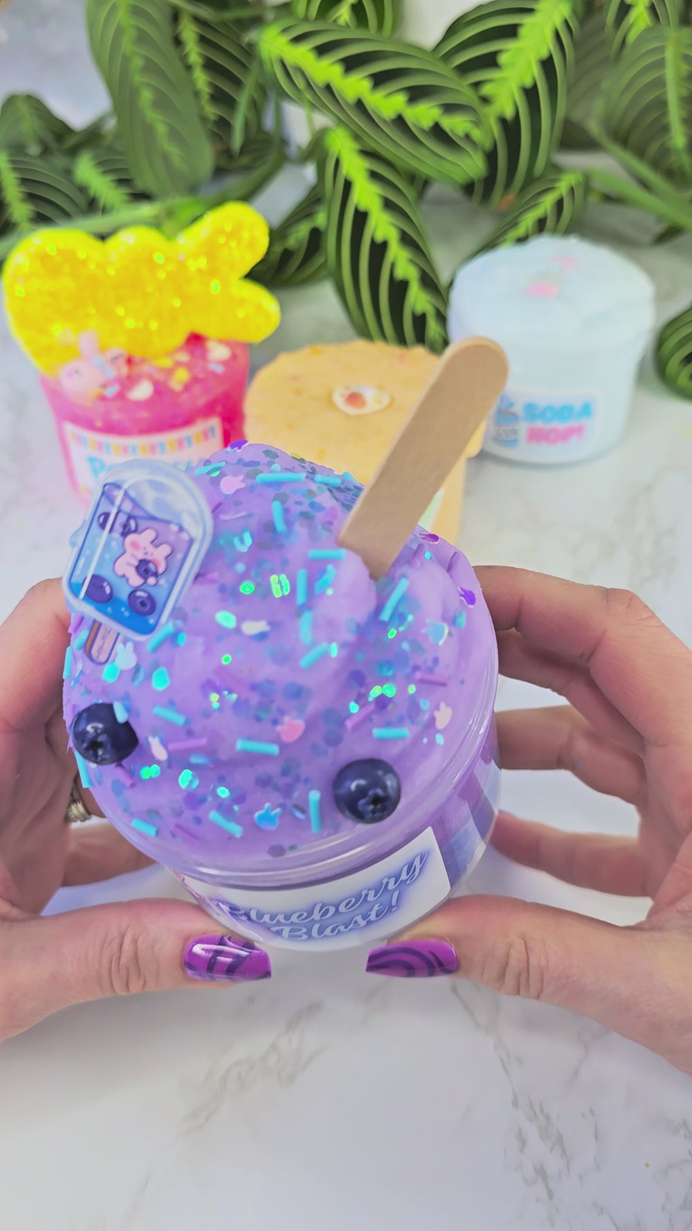 Blueberry blast is a two toned gelato dream! This is a soft, drizzly, dry icee! This texture is a hit for all ages. It comes with a glitter and sprinkle mix that includes two squishy blueberries (YES SQUISHY), a planar charm and popsicle stick!