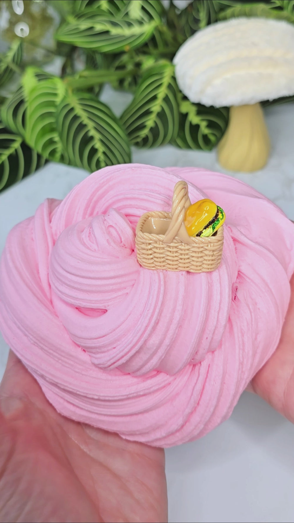 This slime comes with two charms! A random colored picnic basket and a sandwich charm. It also comes with large cookie sprinkles, chunky leaf glitter, mini squirrel charms and sliced peaches!
