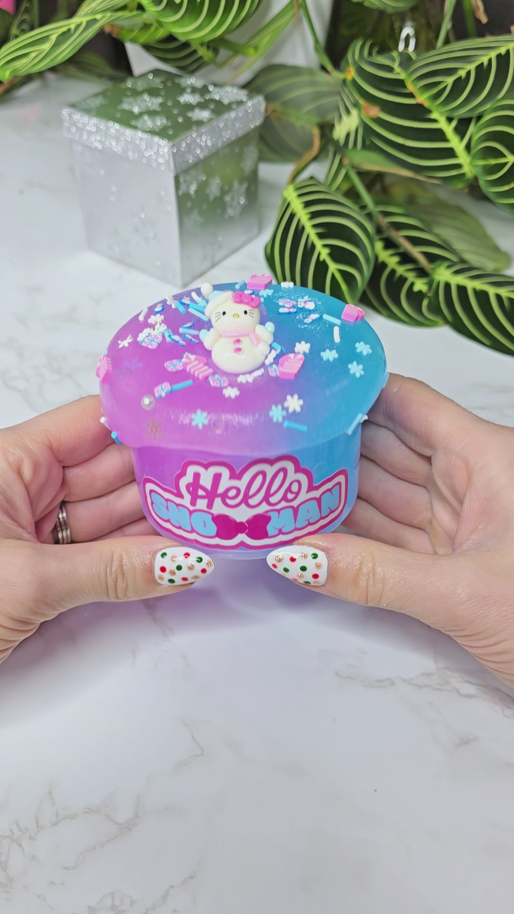 Hello Snowman is a new Hello Kitty themed slime! It's made with our classic coated jelly recipe that's thick and inflating! It's half pink and half blue (colors may mix during shipping) and is scented with a candy blend of fruit, spun sugar, caramel and sweet vanilla!