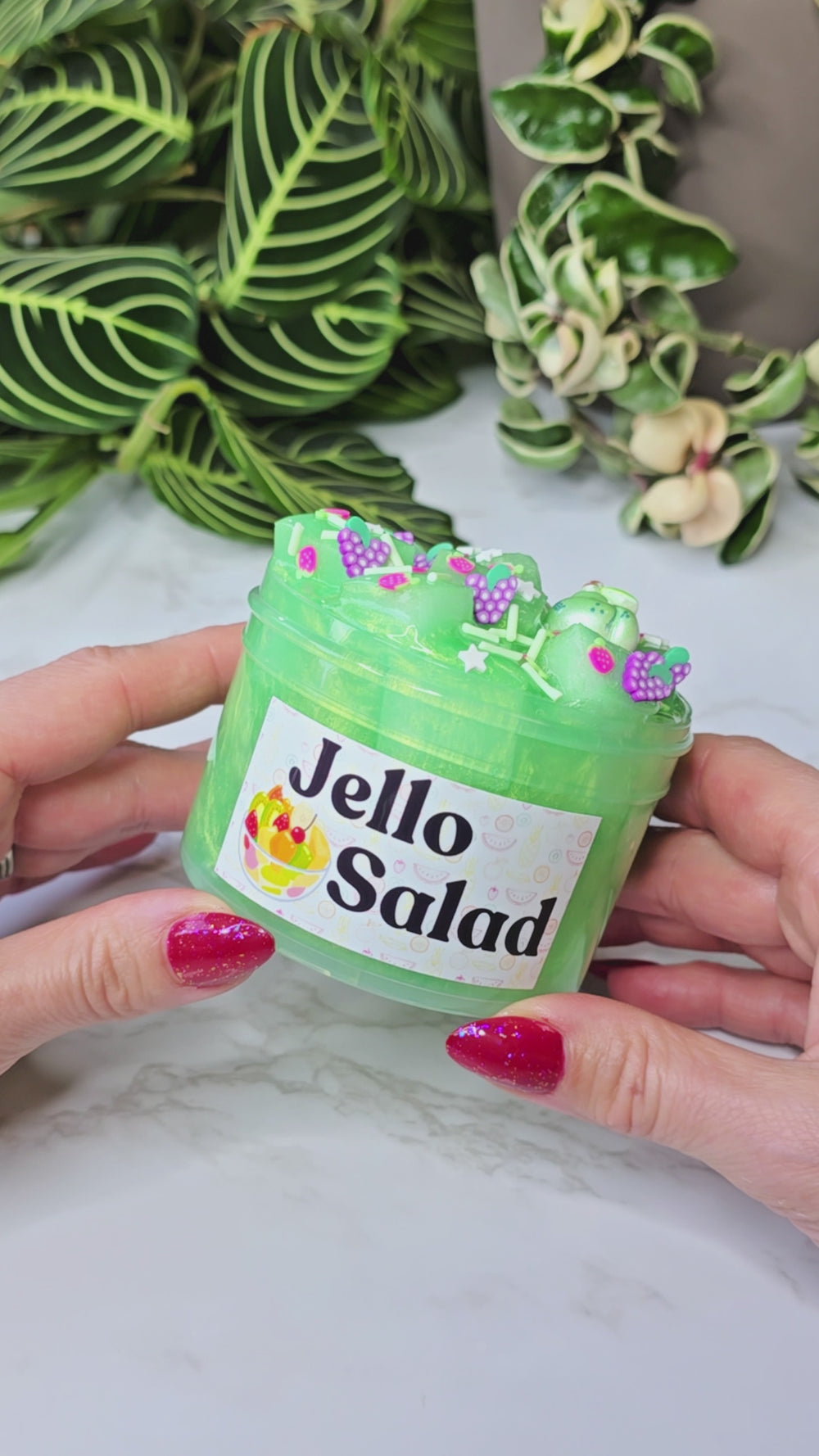 Jello Salad is a pigmented jelly cube slime! It's such a beautiful creamy color of Jade. The jelly cubes are different sizes and adds to a fun texture experience. Great for bubble pops! It's scented like Bartlett Pear and comes with magenta colored strawberry sprinkles, stars, matching jade sprinkles, large purple grape sprinkles and a cute Pear charm!