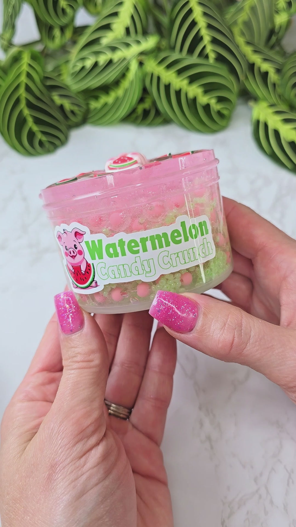 Watermelon Candy Crunch has pink mini frog spawn beads and green seed beads! It's super crunchy and addicting to play with. For an even crunchier experience, be sure to take off the top layer of clear slime and just play with the bead portion of the slime. This one is scented with my most favorite scent of all time, Watermelon Lemonade!
