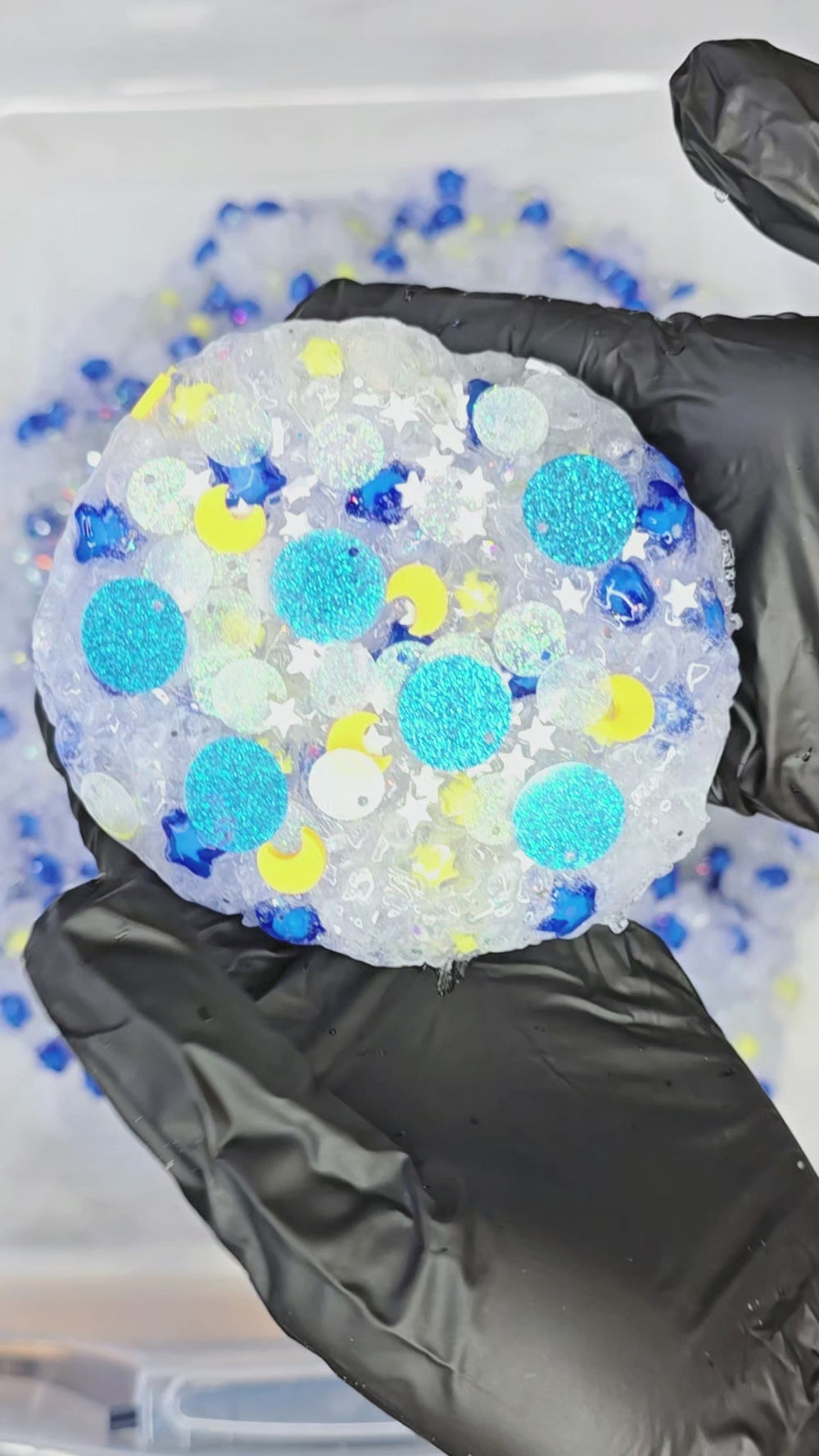 Starry Night is a silica bomb with yellow and blue star shaped beads! It's super crunchy and satisfying to play with. it has holographic glitter throughout and is topped with a beautiful glitter mix with white stars, yellow moons and huge circle glitter! This comes in our 5 oz container vs a 7oz container for a better price point!
