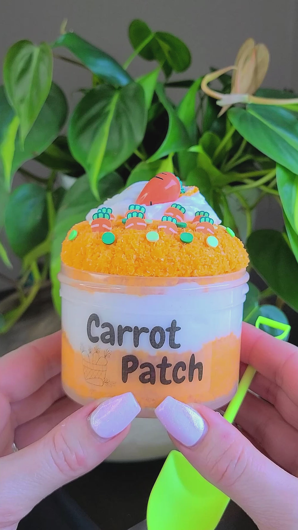 Carrot Patch is a 9oz semi diy Butter Fizz. The base is a 7 oz super packed snow fizz and comes with a cinnamon speckled 2 oz butter slime. I took the carrot slices and poked them into the top to create my little carrot patch 😍 Once mixed it's an inflating, soft butterfizz! It's crispy and stretchy! If you like crunchy slimes, you'll love this one! Scented like a frosted carrot cake!