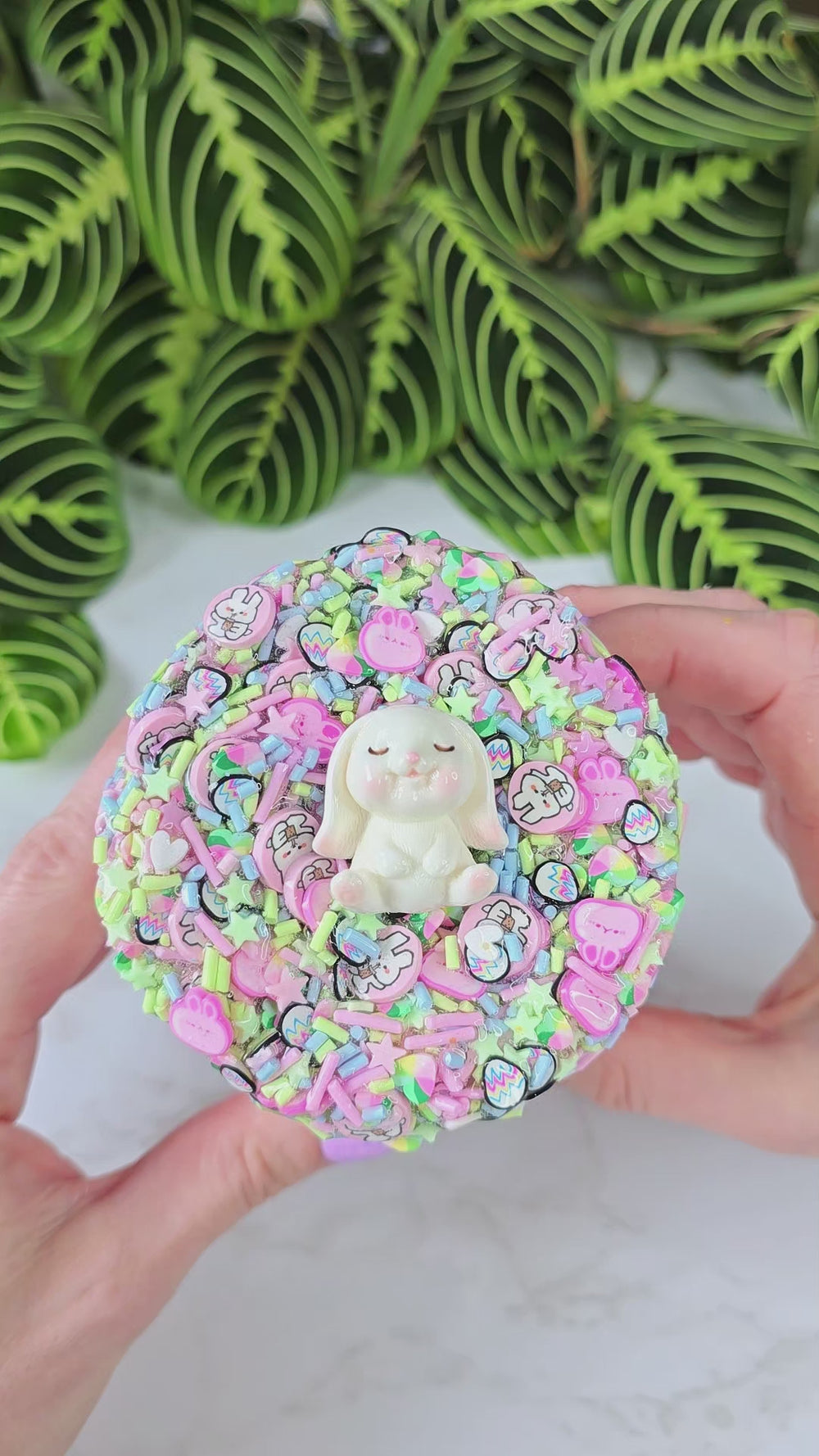 Floppy The Bunny is a long requested thick and silky slime with a fimo crust! Similar texture to Panda N' Pumpkins! It comes with a 2oz fimo bomb that's a personal mix of Easter themed sprinkles. The combination of these two textures are incredible! It's so satisfying to crush the fimo bomb into the thick and silky slime.