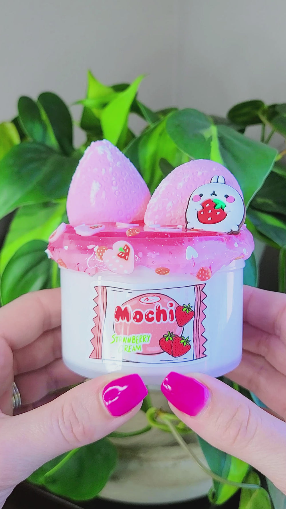 If you love Mochi, you'll LOVE this slime! Mochi Strawberry Cream has two textured strawberries that are sprinkled with corn starch. It also comes with a berry colored glittery 1 oz of slime. Once mixed, it feels like you're playing with Mochi dough! It's creamy, stretchy, slightly bouncy and inflates into a little dough cloud. This is my favorite texture of this restock and I am SO excited about this one!